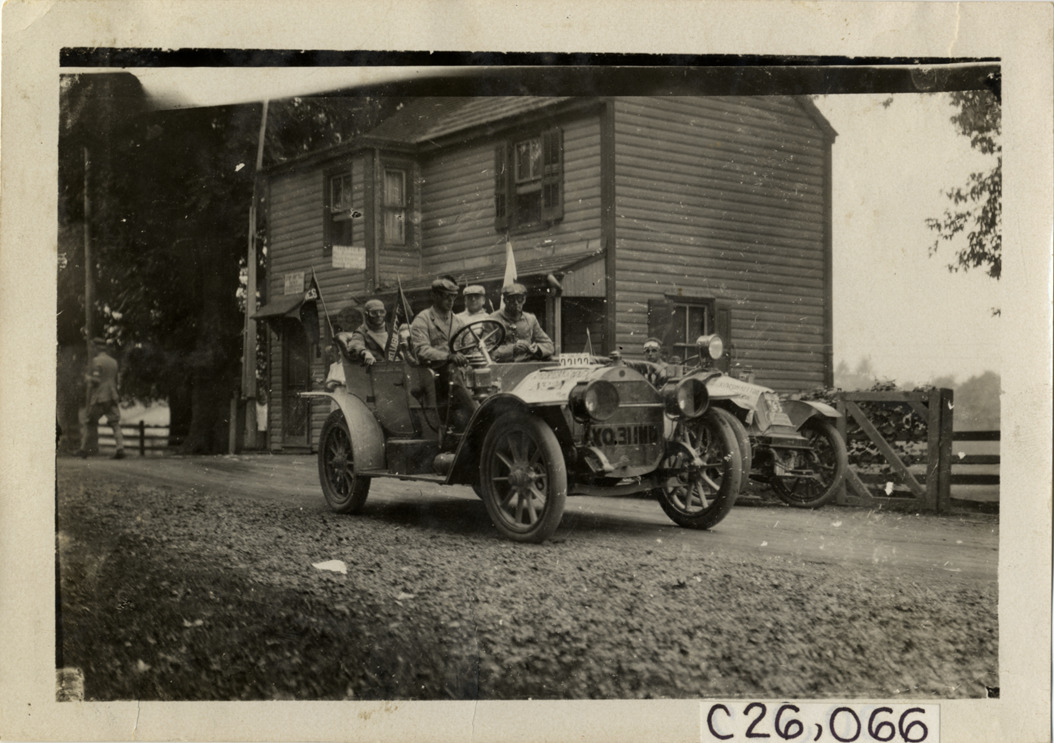 Motorists in American Simplex automobile in front of tollhouse, 1909 Munsey Reliability Run