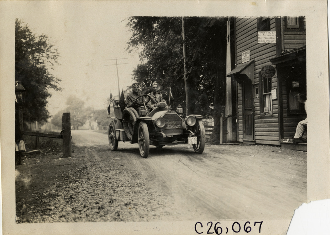Motorists in Chalmers-Detroit automobile in front of tollhouse, 1909 Munsey Reliability Run