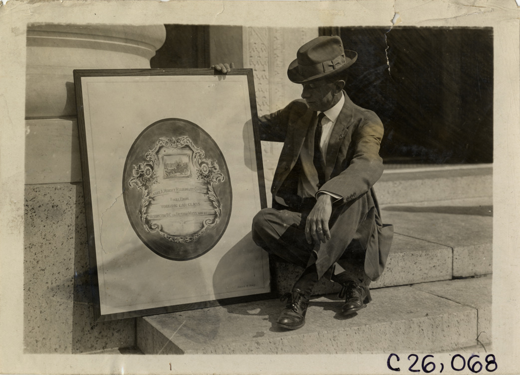 Man posing with painting of Munsey Reliability Contest plaque, 1909 Munsey Reliability Run