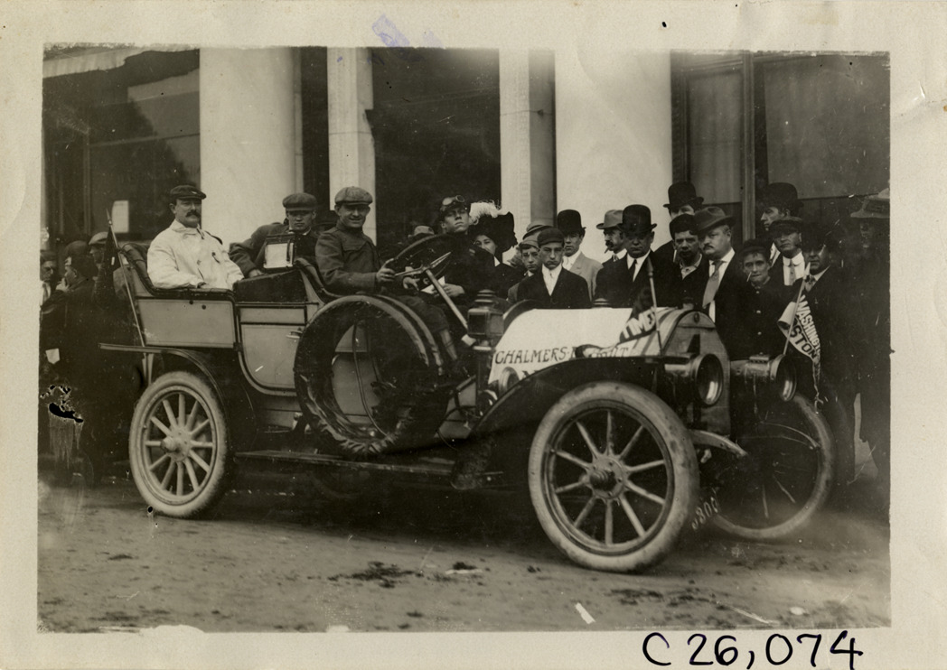 Motorists posing in Chalmers-Detroit automobile, 1909 Munsey Reliability Run