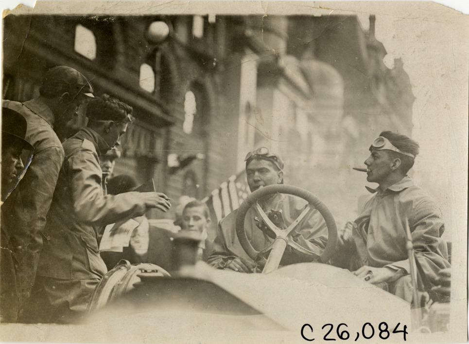 Driver and passenger in automobile, 1909 Munsey Reliability Run