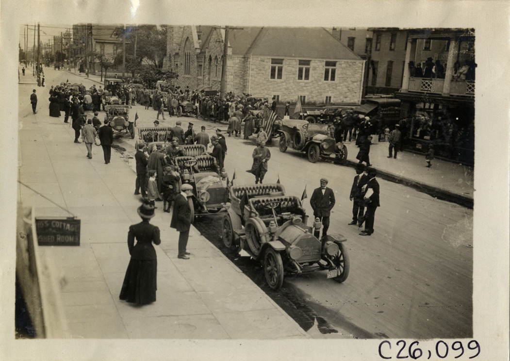Automobiles lined up in street, 1909 Munsey Reliability Run