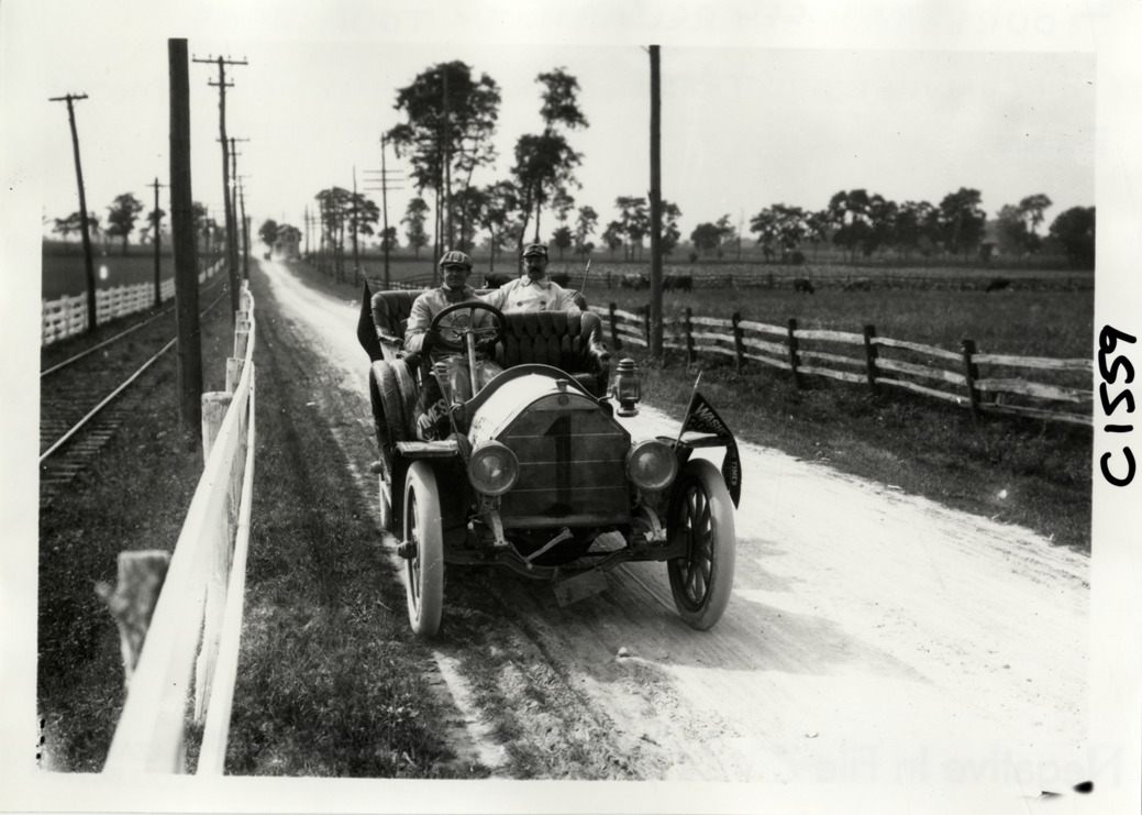 View of motorists posing with Chalmers-Detroit car no. 1 on rural dirt road during the 1909 Munsey Reliability Run. Handwritten on back: "#1 Chalmers-Detroit, Chalmers-Detroit Motor Car Co., Detroit, MI. Tours--Munsey Reliability Run, 1909."