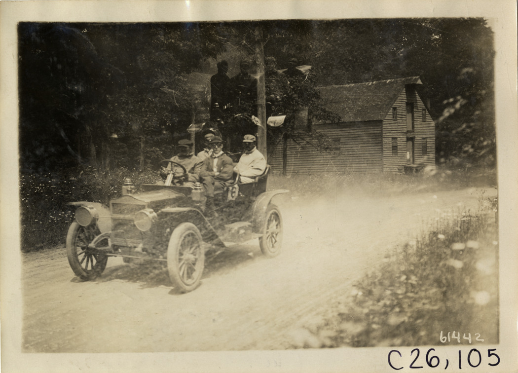 View of motorists in Maxwell car no. 6 traveling on rural dirt road near Bloomingdale, New Jersey during the 1910 New Jersey Reliability Run. Wooden-frame house in background. The endurance run, sponsored by the Motor Contest Association, covered a route from New York to Atlantic City and return. Stamped on back: "Spooner & Wells, Inc., photographers, telephones 3472-3473 Columbus, 1931 Broadway, New York." Handwritten on back: "J.W. Mason, #6 Maxwell, perfect score, near Bloomingdale. Tours--New Jersey Reliability Run, 1910." Double exposure.