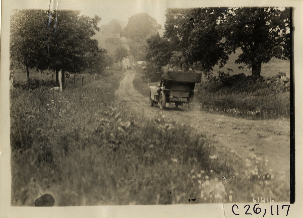 Rear view of motorists in Peerless press car traveling on rural dirt road near Hackettstown, New Jersey during the 1910 New Jersey Reliability Run. The endurance run, sponsored by the Motor Contest Association, covered a route from New York to Atlantic City and return. Stamped on back: "Spooner & Wells, Inc., photographers, telephones 3472-3473 Columbus, 1931 Broadway, New York." Handwritten on back: "Peerless press car meeting 33 Hupmobile taking on water. Tours--New Jersey Reliability Run, 1910."