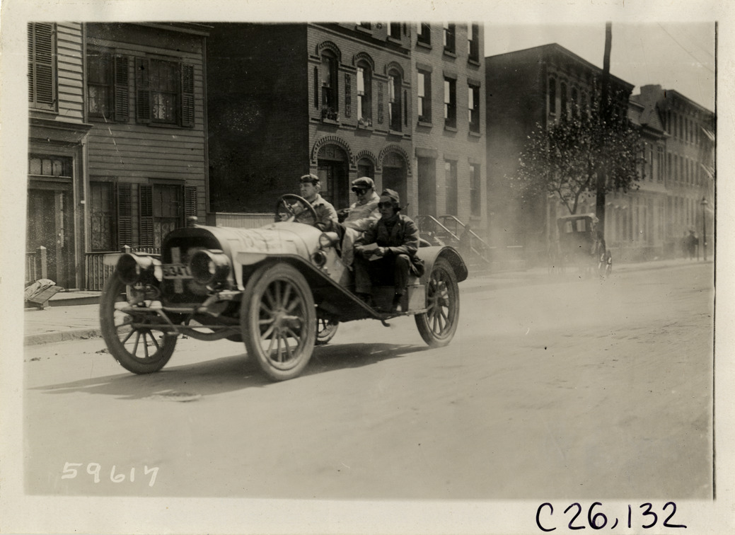 View of motorists traveling in car during the 1910 New Jersey Reliability Run. Residential buildings in background. The endurance run, sponsored by the Motor Contest Association, covered a route from New York to Atlantic City and return. Stamped on back: "Spooner & Wells, Inc., photographers, telephones 3472-3473 Columbus, 1931 Broadway, New York." Handwritten on back: "Tours--New Jersey Reliability Run, 1910."