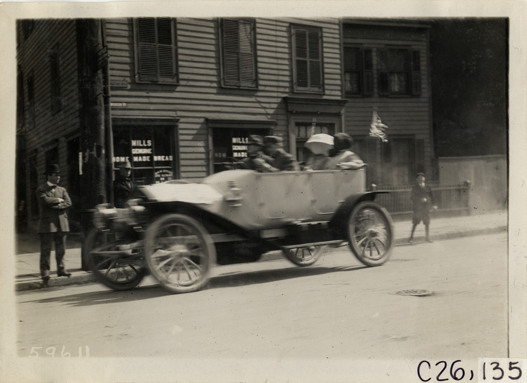 View of motorists traveling in car during the 1910 New Jersey Reliability Run. Mills Bakery in background. The endurance run, sponsored by the Motor Contest Association, covered a route from New York to Atlantic City and return. Stamped on back: "Spooner & Wells, Inc., photographers, telephones 3472-3473 Columbus, 1931 Broadway, New York." Handwritten on back: "Tours--New Jersey Reliability Run, 1910."