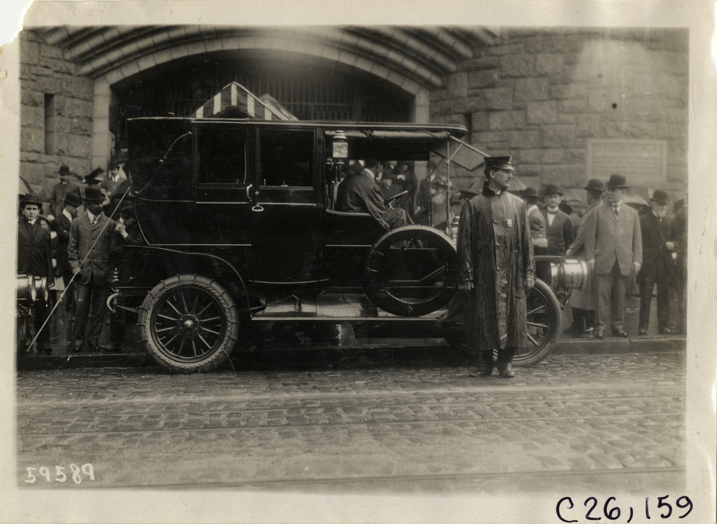 View of a police officer standing next to car in front of the Seventy-First Regiment Armory building in New York during the 1910 New Jersey Reliability Run. Spectators stand on sidewalk. The endurance run, sponsored by the Motor Contest Association, covered a route from New York to Atlantic City and return. Stamped on back: "Spooner & Wells, Inc., photographers, telephones 3472-3473 Columbus, 1931 Broadway, New York." Handwritten on back: "Tours--New Jersey Reliability Run, 1910."