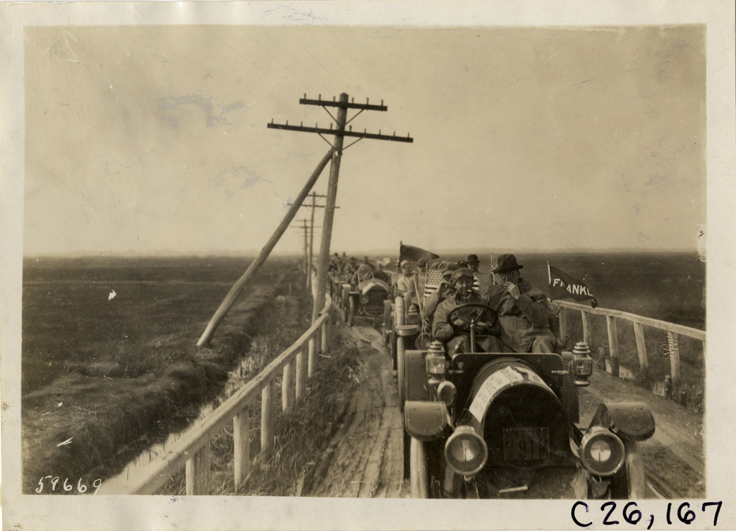 View of motorists in cars traveling on rural dirt road during the 1910 New Jersey Reliability Run. Franklin car in foreground. The endurance run, sponsored by the Motor Contest Association, covered a route from New York to Atlantic City and return. Stamped on back: "Spooner & Wells, Inc., photographers, telephones 3472-3473 Columbus, 1931 Broadway, New York." Handwritten on back: "Tours--New Jersey Reliability Run, 1910."