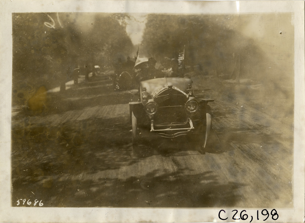 View of motorists in cars traveling on tree-lined dirt road during the 1910 New Jersey Reliability Run. The endurance run, sponsored by the Motor Contest Association, covered a route from New York to Atlantic City and return. Stamped on back: "Spooner & Wells, Inc., photographers, telephones 3472-3473 Columbus, 1931 Broadway, New York." Handwritten on back: "Tours--New Jersey Reliability Run, 1910."