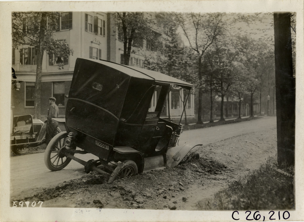 Rear view of car with two wheels stuck in ditch on roadside during the 1910 New Jersey Reliability Run. Houses in background. The endurance run, sponsored by the Motor Contest Association, covered a route from New York to Atlantic City and return. Stamped on back: "Spooner & Wells, Inc., photographers, telephones 3472-3473 Columbus, 1931 Broadway, New York." Handwritten on back: "Tours--New Jersey Reliability Run, 1910."