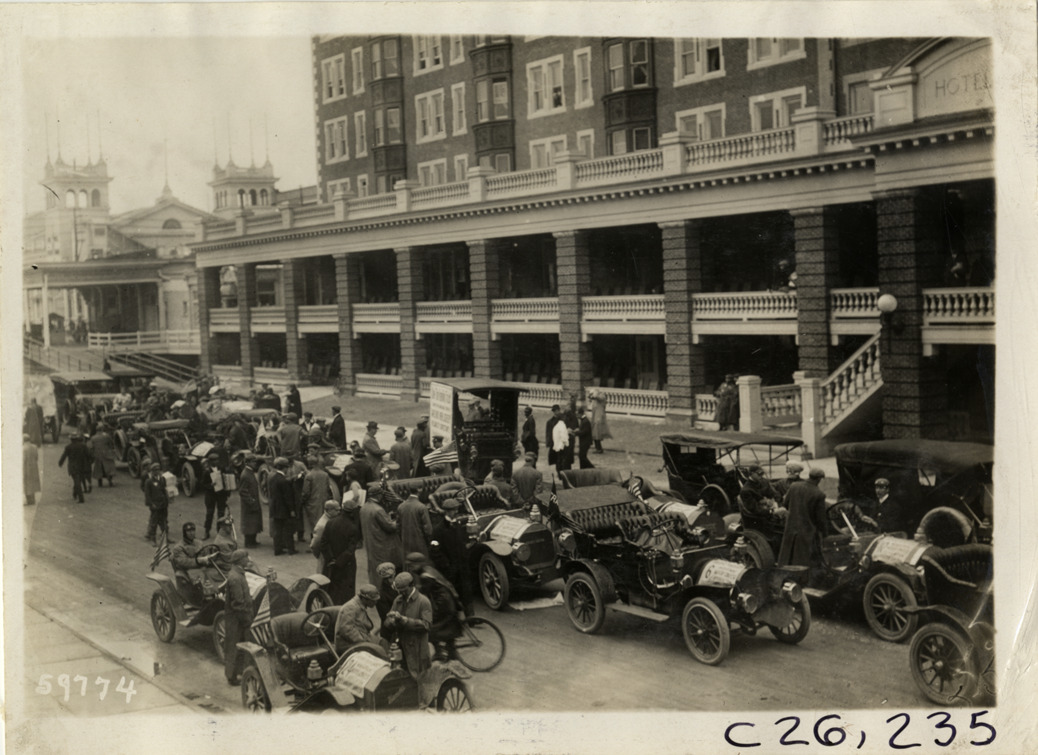 Automobiles lined up in street in front of Strand Hotel, Atlantic City, New Jersey, 1910 New Jersey Reliability Run