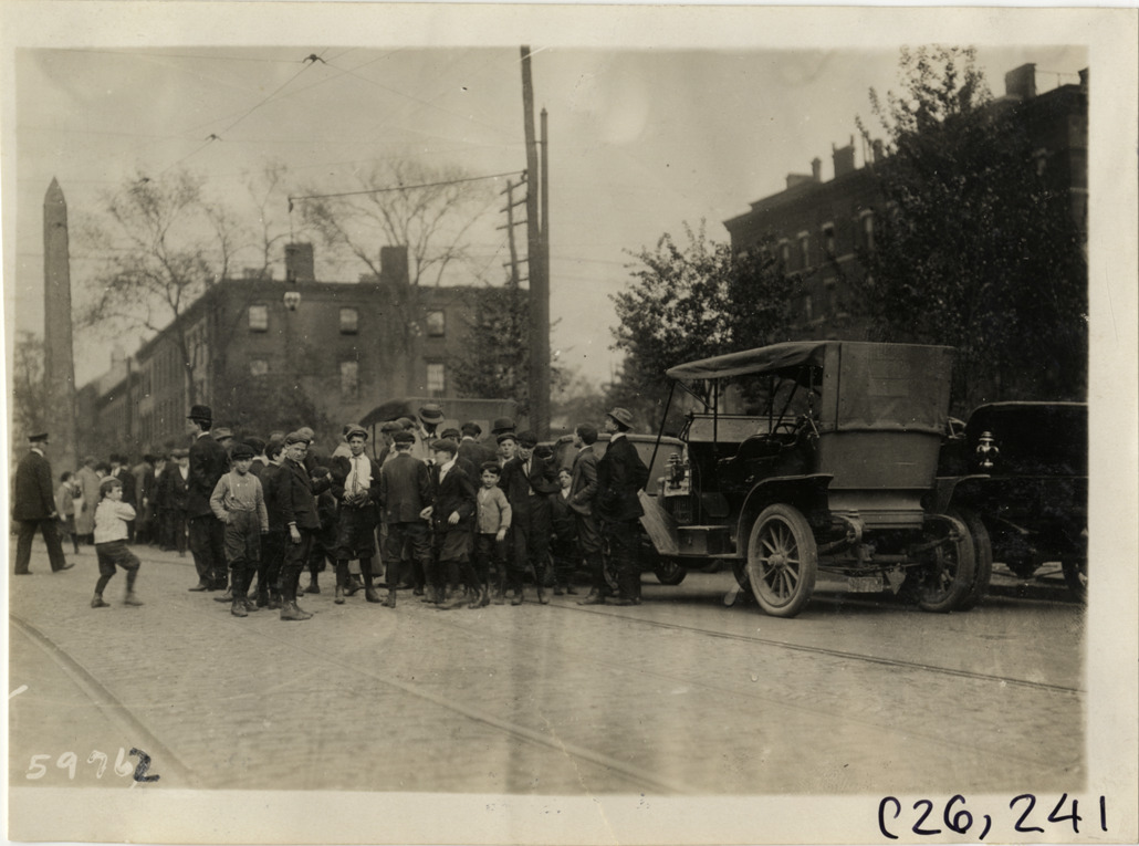 View of group of boys standing in street next to parked cars during the 1910 New Jersey Reliability Run. Obelisk in background. The endurance run, sponsored by the Motor Contest Association, covered a route from New York to Atlantic City and return. Stamped on back: "Spooner & Wells, Inc., photographers, telephones 3472-3473 Columbus, 1931 Broadway, New York." Handwritten on back: "Tours--New Jersey Reliability Run, 1910."