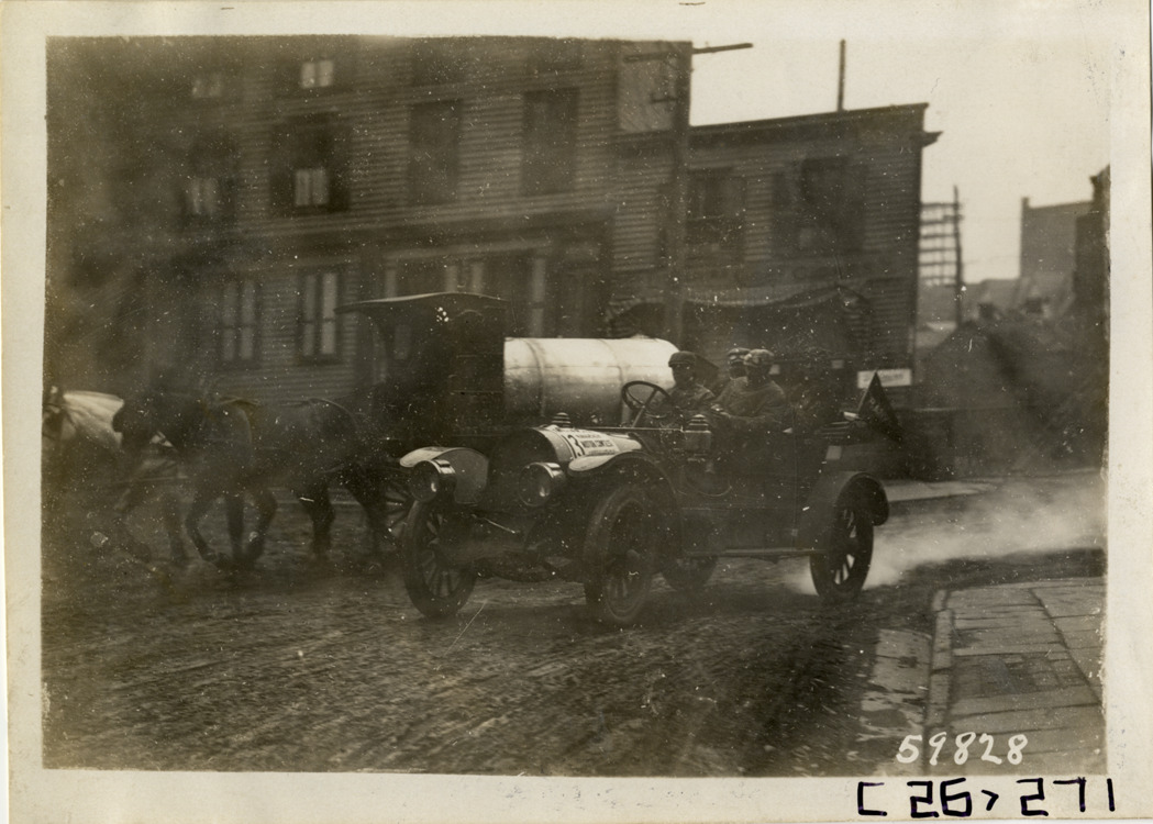 View of motorists in car no. 13 passing horse-drawn wagon during the 1910 New Jersey Reliability Run. The endurance run, sponsored by the Motor Contest Association, covered a route from New York to Atlantic City and return. Stamped on back: "Spooner & Wells, Inc., photographers, telephones 3472-3473 Columbus, 1931 Broadway, New York." Handwritten on back: "Tours--New Jersey Reliability Run, 1910."