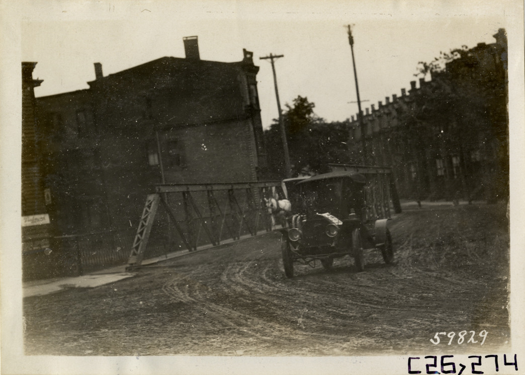 View of motorists in car crossing bridge during the 1910 New Jersey Reliability Run. The endurance run, sponsored by the Motor Contest Association, covered a route from New York to Atlantic City and return. Stamped on back: "Spooner & Wells, Inc., photographers, telephones 3472-3473 Columbus, 1931 Broadway, New York." Handwritten on back: "Tours--New Jersey Reliability Run, 1910."