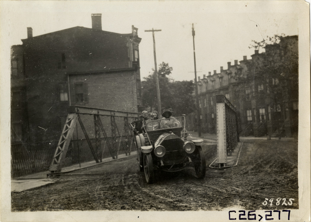 Motorists in automobile crossing bridge, 1910 New Jersey Reliability Run