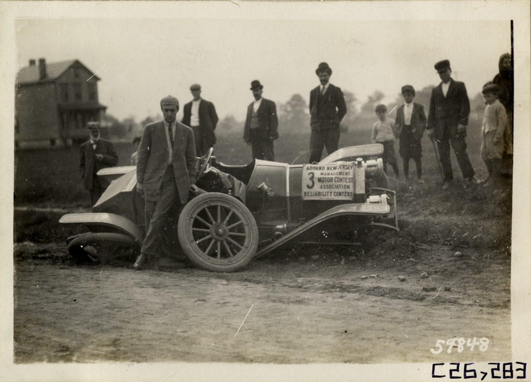 View of motorist posing with damaged Cole car no. 3 on rural road during the 1910 New Jersey Reliability Run. Onlookers in background. The endurance run, sponsored by the Motor Contest Association, covered a route from New York to Atlantic City and return. Stamped on back: "Spooner & Wells, Inc., photographers, telephones 3472-3473 Columbus, 1931 Broadway, New York." Handwritten on back: "Tours--New Jersey Reliability Run, 1910."