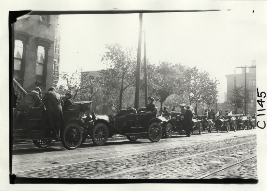 Automobiles lined up in street, 1910 New Jersey Reliability Run