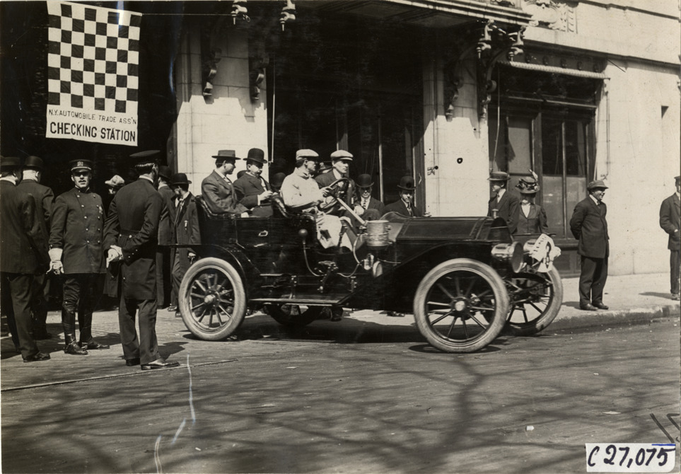 View of motorists in car no. 8 at checking station during the 1909 New York Economy Contest. Spectators, policemen and "N.Y. Automobile Trade Ass'n checking station" flag in background. The one-gallon efficiency contest was sponsored by the New York Automobile Trade Association as part of its second annual automobile carnival. Stamped on back: "Spooner and Wells, 1931 Broadway, New York, duplicates any time, enlargements all sizes, tel. 3472-3473 Col., credit appreciated." Handwritten on back: "Tours--New York Economy Contest, 1909."