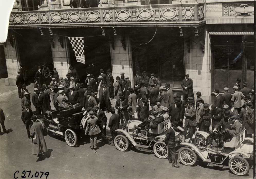 View of spectators and motorists with three cars lined up in front of checking station during the 1909 New York Economy Contest. Car no. 21 and no. 22 on far right; "N.Y. Automobile Trade Ass'n checking station" flag in background. The one-gallon efficiency contest was sponsored by the New York Automobile Trade Association as part of its second annual automobile carnival. Stamped on back: "Spooner and Wells, 1931 Broadway, New York, duplicates any time, enlargements all sizes, tel. 3472-3473 Col., credit appreciated." Handwritten on back: "Tours--New York Economy Contest, 1909."