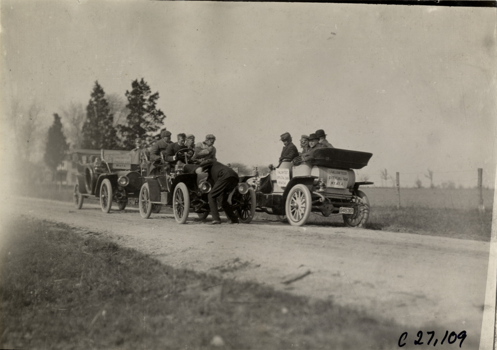View of motorists with official car, press car and contestant car on rural dirt road during the 1909 New York Economy Contest. The one-gallon efficiency contest was sponsored by the New York Automobile Trade Association as part of its second annual automobile carnival. Handwritten on back: "Tours--New York Economy Contest, 1909."