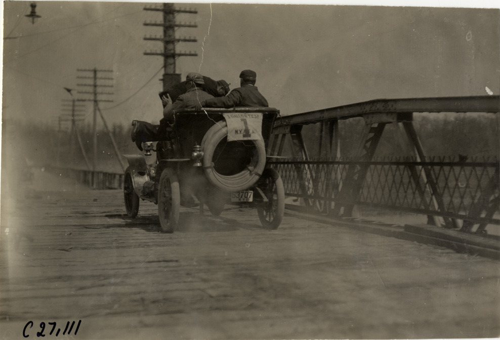 Rear view of motorists in car no. 1 crossing bridge during the 1909 New York Economy Contest. The one-gallon efficiency contest was sponsored by the New York Automobile Trade Association as part of its second annual automobile carnival. Stamped on back: "Spooner and Wells, 1931 Broadway, New York, duplicates any time, enlargements all sizes, tel. 3472-3473 Col., credit appreciated." Handwritten on back: "Tours--New York Economy Contest, 1909."