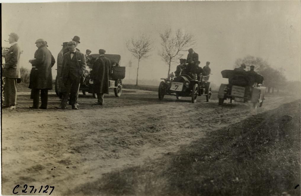 View of motorists with three cars on rural dirt road during the 1909 New York Economy Contest. Car no. 7 in center of road. The one-gallon efficiency contest was sponsored by the New York Automobile Trade Association as part of its second annual automobile carnival. Stamped on back: "Spooner & Wells, Inc., photographers, telephones 3472-3473 Columbus, 1931 Broadway, New York." Handwritten on back: "Tours--New York Economy Contest, 1909."