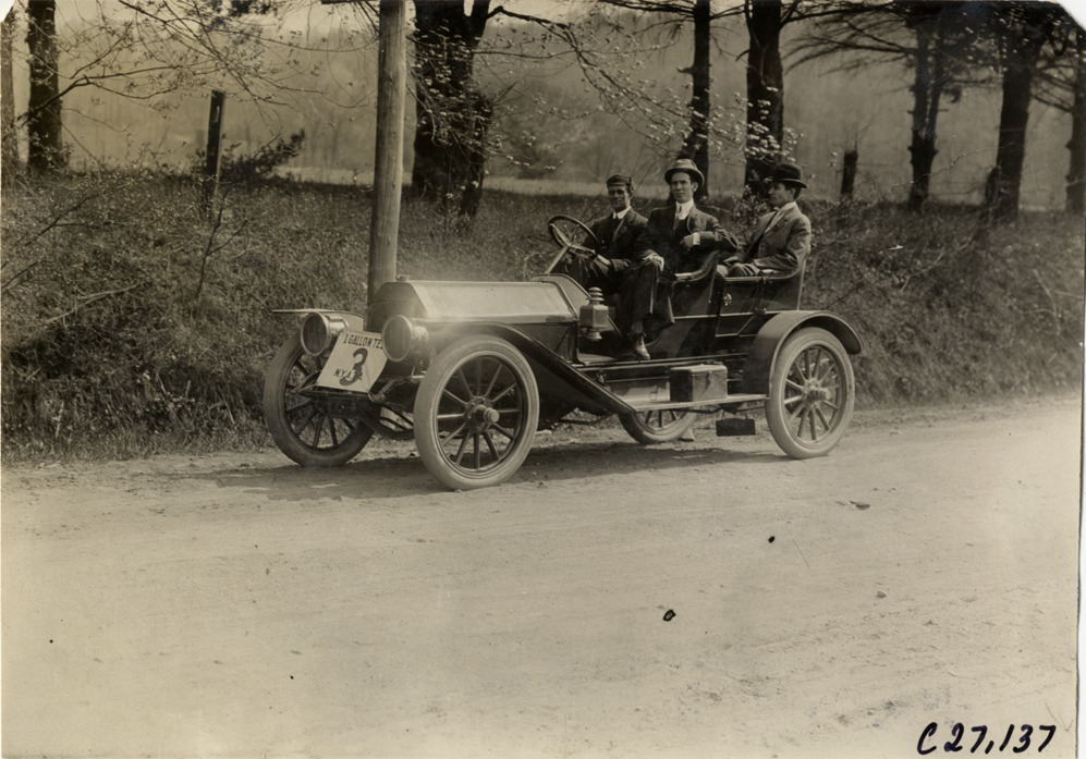 View of motorists posing in car no. 3 on rural dirt road during the 1909 New York Economy Contest. The one-gallon efficiency contest was sponsored by the New York Automobile Trade Association as part of its second annual automobile carnival. Stamped on back: "Spooner & Wells, Inc., photographers, telephones 3472-3473 Columbus, 1931 Broadway, New York." Handwritten on back: "Tours--New York Economy Contest, 1909."