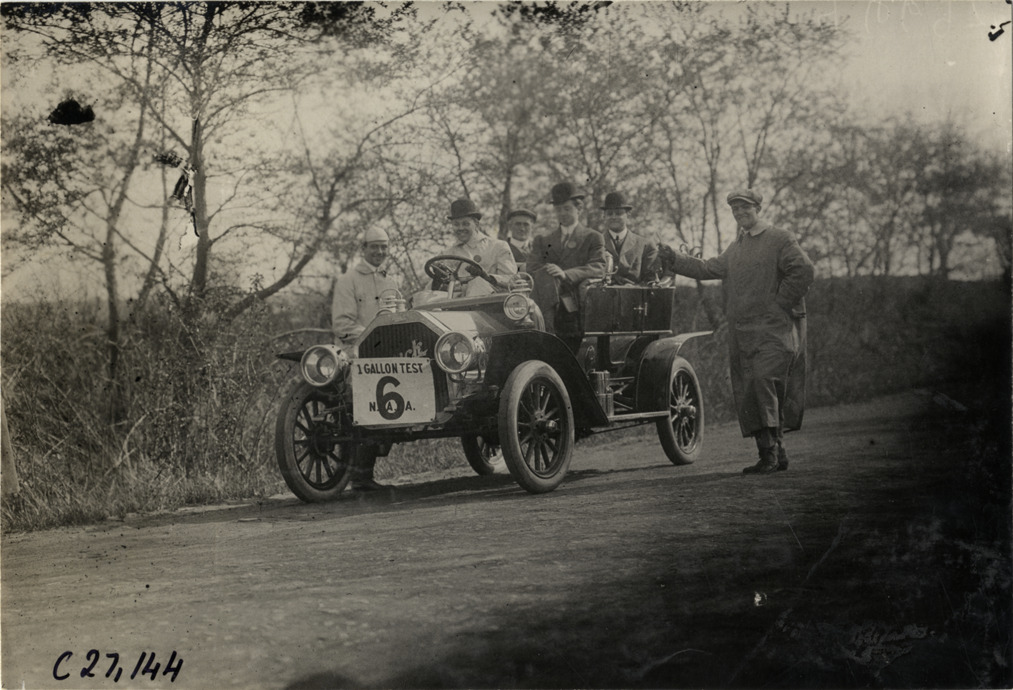 View of motorists posing with car no. 6 on rural dirt road during the 1909 New York Economy Contest. The one-gallon efficiency contest was sponsored by the New York Automobile Trade Association as part of its second annual automobile carnival. Handwritten on back: "Tours--New York Economy Contest, 1909."
