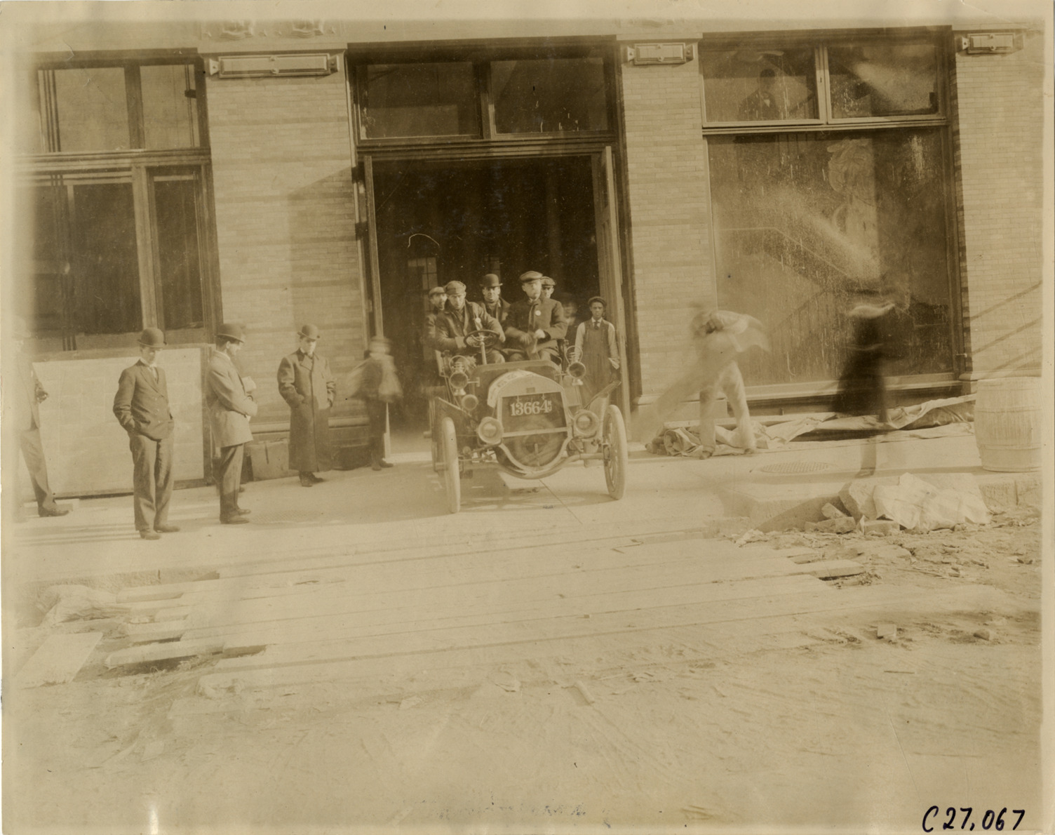 View of motorists posing in Frayer-Miller touring car in front of the Smith & Mabley Garage during the 1905 New York Economy Contest. Contestants made three round trips from New York to Philadelphia, New York to Albany, and New York to South Hampton. Stamped on back: "Photo by F. Ed. Spooner, 1536 B'way, telephone 6536-38th St., New York, N.Y." Handwritten on back: "Frayer-Miller touring. Tours--New York Motor Club Economy Contest, 1905."