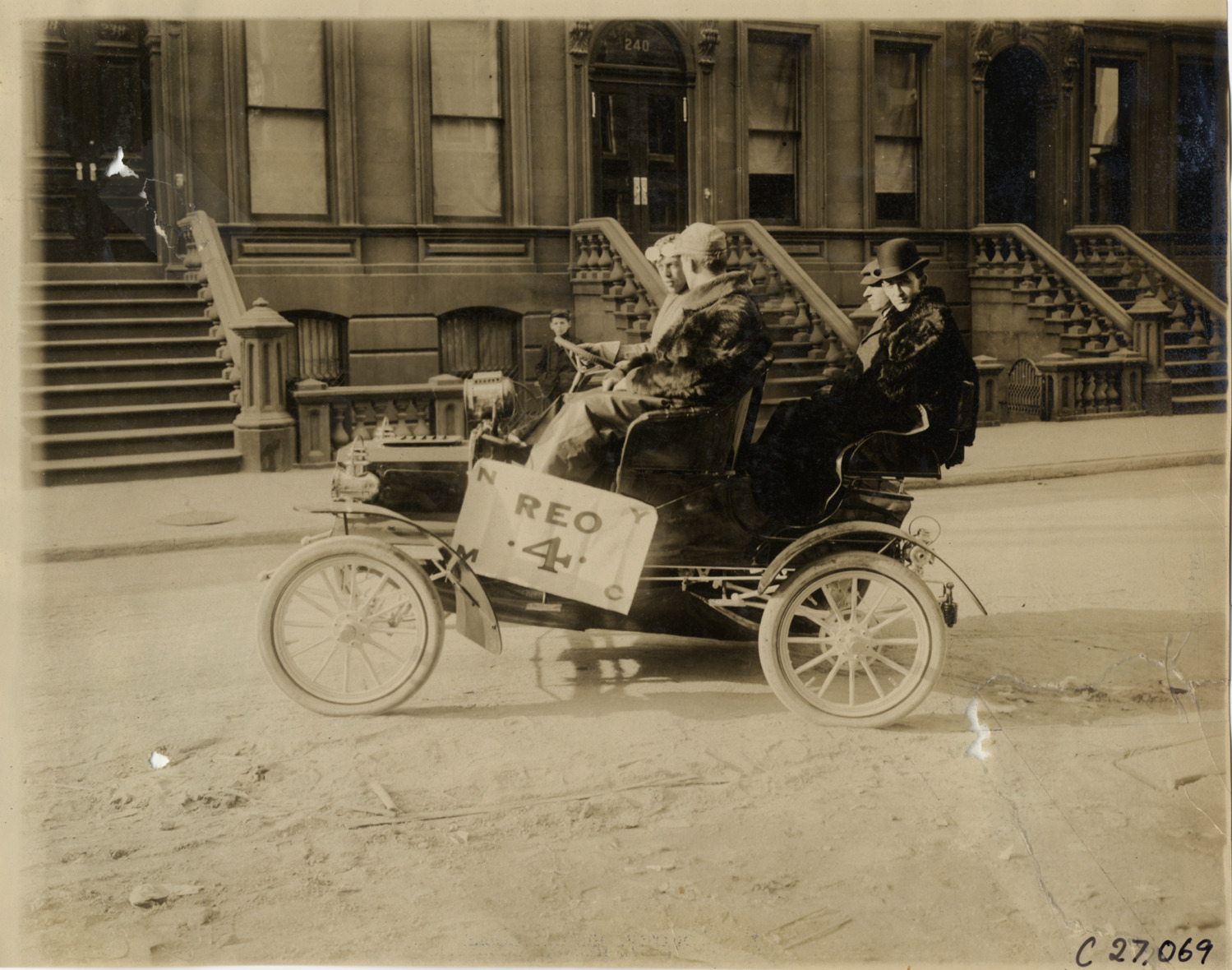 View of motorists in Reo runabout car no. 4 during the 1905 New York Economy Contest. Residential buildings in background. Contestants made three round trips from New York to Philadelphia, New York to Albany, and New York to South Hampton. Stamped on back: "Photo by F. Ed. Spooner, 1536 B'way, telephone 6536-38th St., New York, N.Y." Handwritten on back: "#4 Reo runabout. Tours--New York Motor Club Economy Contest, 1905."