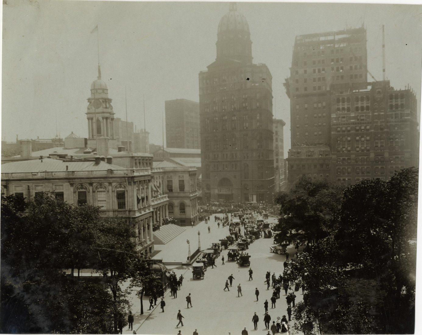Distant view of parade of cars in front of the New York City Hall during the 1906 second annual excursion for orphans sponsored by the New York Motor Club. World Building in background. 1,200 children were taken on a trip to the Dreamland amusement park at Coney Island. Stamped on back: "Photo by F. Ed. Spooner, 1536 B'way, telephone 6536-38th St., New York, N.Y." Handwritten on back: "Orphans Parade, 6/6/06. Tours--New York Orphans Day outing, 1906."