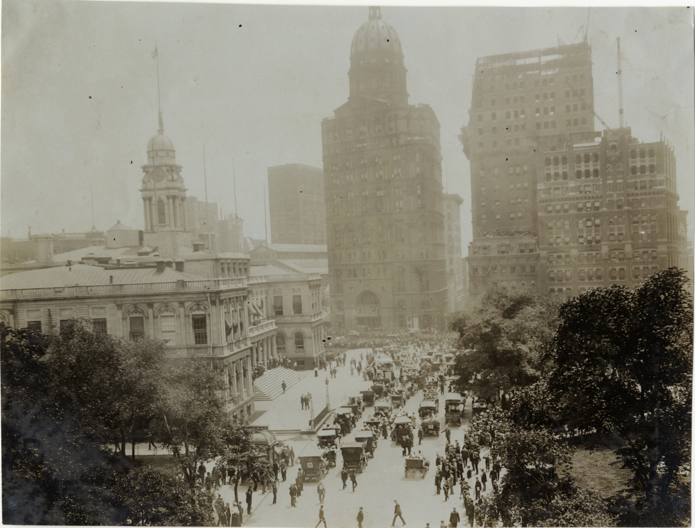 Distant view of parade of cars in front of the New York City Hall during the 1906 second annual excursion for orphans sponsored by the New York Motor Club. World Building in background. 1,200 children were taken on a trip to the Dreamland amusement park at Coney Island. Stamped on back: "Photo by F. Ed. Spooner, 1536 B'way, telephone 6536-38th St., New York, N.Y." Handwritten on back: "Orphans Parade, 6/6/06. Massed in City Hall park. Tours--New York Orphans Day outing, 1906."