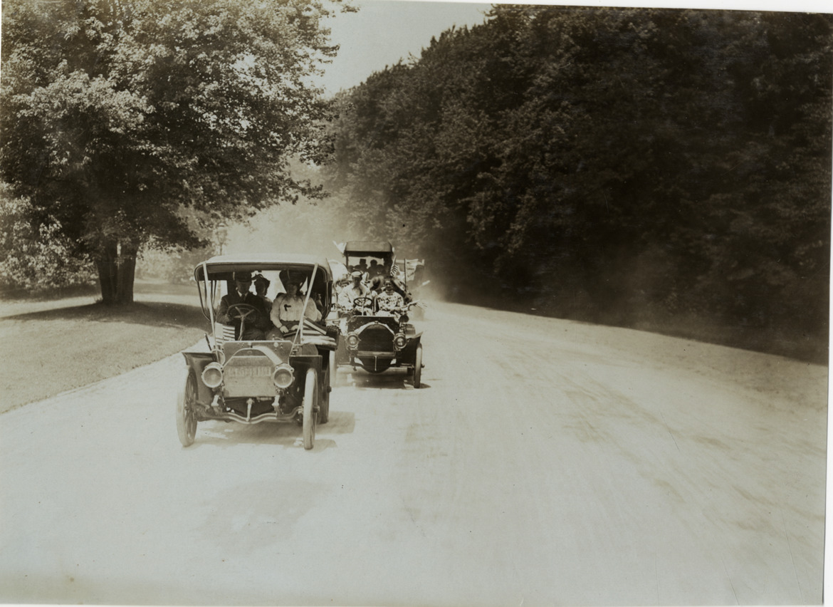 View of cars in parade traveling through Prospect Park in Brooklyn during the 1906 second annual excursion for orphans sponsored by the New York Motor Club. 1,200 children were taken on a trip to the Dreamland amusement park at Coney Island. Stamped on back: "Photo by F. Ed. Spooner, 1536 B'way, telephone 6536-38th St., New York, N.Y." Handwritten on back: "Tours--New York Orphans Day outing, 1906."