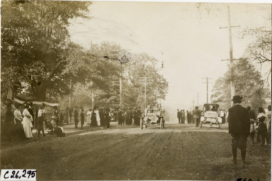 Motorists in automobile passing spectators on roadside, 1909 New York-Atlanta Good Roads Tour