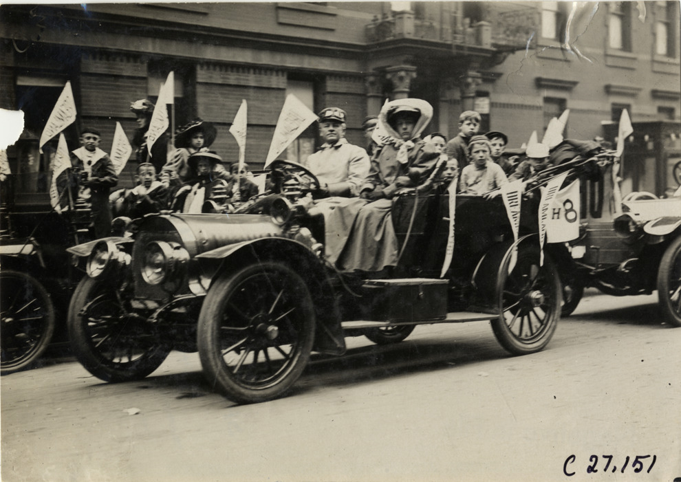 Children and motorists posing in Rainier automobile, 1909 New York Orphans Day outing