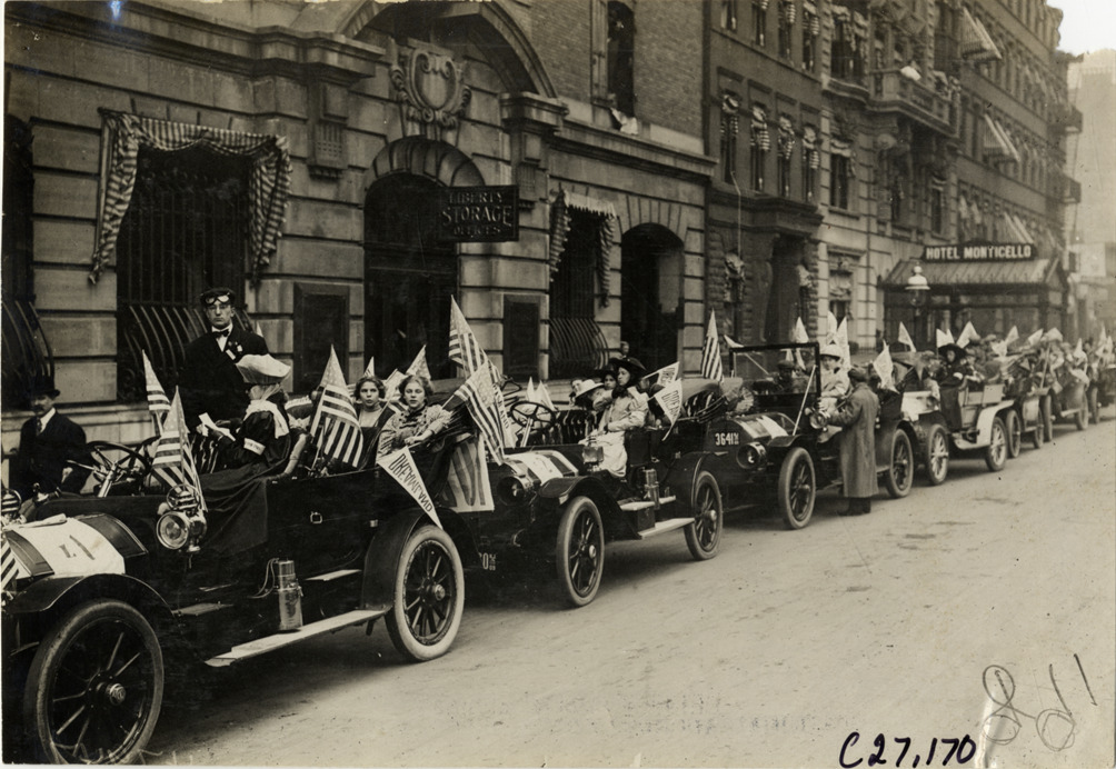 View of children and motorists in cars lined up in street during the 1909 annual excursion for orphans sponsored by the Orphan's Automobile Day Committee of New York. Cars are decorated with "Dreamland" pennants and American flags; Liberty Storage and Hotel Monticello in background. Approximately 1,800 children were taken on a trip to the Dreamland amusement park at Coney Island. Stamped on back: "Spooner & Wells, Inc., photographers, telephones 3472-3473 Columbus, 1931 Broadway, New York." Handwritten on back: "Tours--New York Orphans Day outing, 1909."
