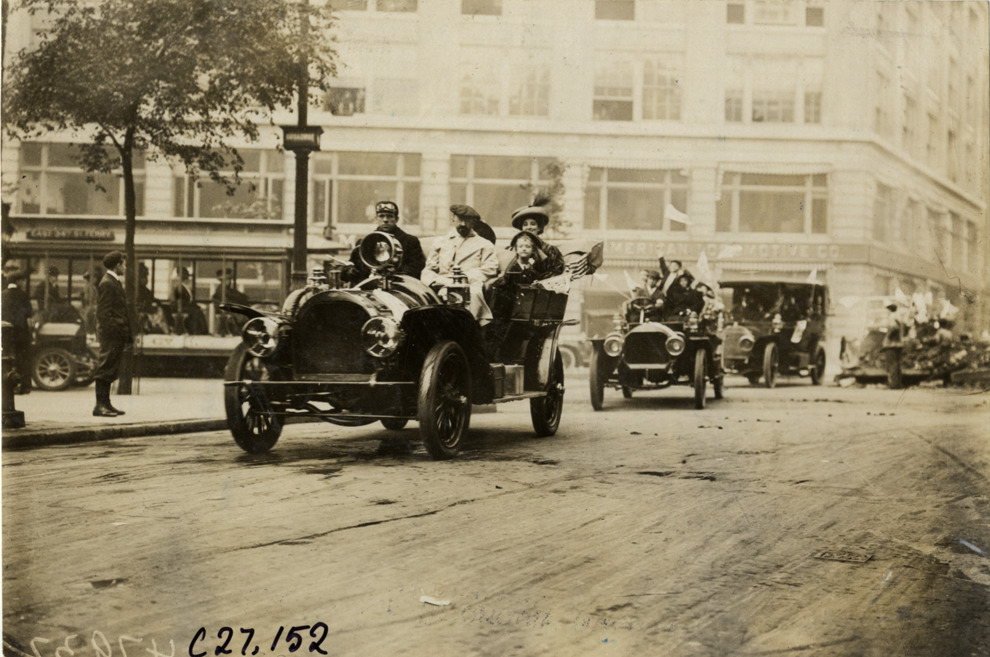 View of children and motorists posing in Royal Tourist car during the 1909 annual excursion for orphans sponsored by the Orphan's Automobile Day Committee of New York. Streetcar, cars and American Locomotive Co. building in background. Approximately 1,800 children were taken on a trip to the Dreamland amusement park at Coney Island. Stamped on back: "Spooner & Wells, Inc., photographers, telephones 3472-3473 Columbus, 1931 Broadway, New York." Handwritten on back: "Royal Tourist. Tours--New York Orphans Day outing, 1909."