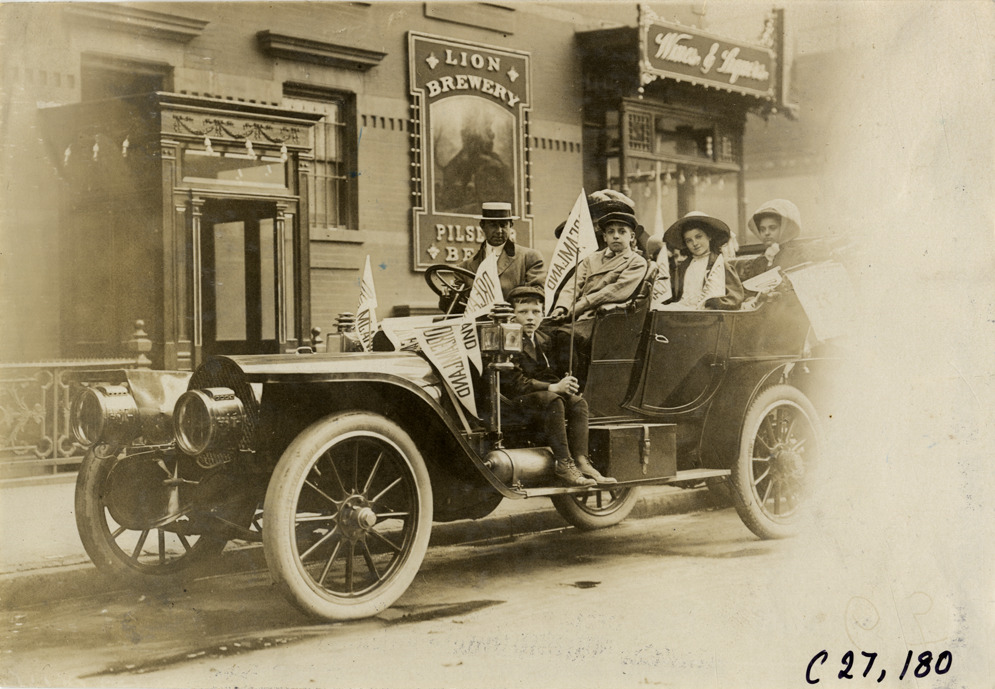 View of children and motorists posing in Franklin car during the 1909 annual excursion for orphans sponsored by the Orphan's Automobile Day Committee of New York. Car is decorated with "Dreamland" pennants; "Lion Brewery" sign in background. Approximately 1,800 children were taken on a trip to the Dreamland amusement park at Coney Island. Stamped on back: "Spooner & Wells, Inc., photographers, telephones 3472-3473 Columbus, 1931 Broadway, New York." Handwritten on back: "Franklin. Tours--New York Orphans Day outing, 1909."