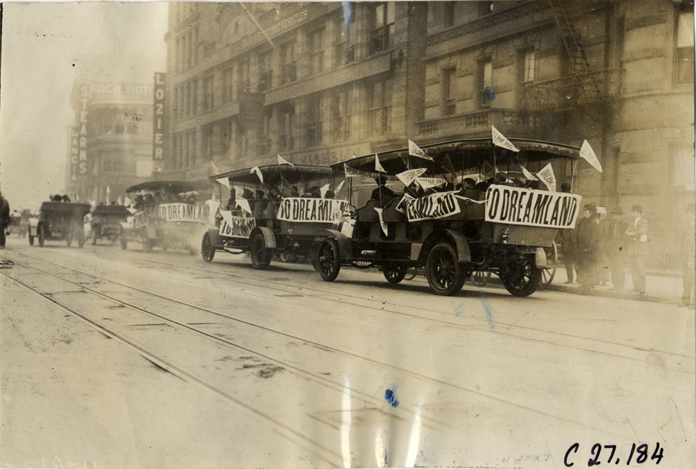Rear view of children and motorists in Manhattan trucks during the 1909 annual excursion for orphans sponsored by the Orphan's Automobile Day Committee of New York. Trucks are decorated with "Dreamland" pennants and "To Dreamland" banners. Approximately 1,800 children were taken on a trip to the Dreamland amusement park at Coney Island. Stamped on back: "Spooner & Wells, Inc., photographers, telephones 3472-3473 Columbus, 1931 Broadway, New York." Handwritten on back: "Tours--New York Orphans Day outing, 1909."