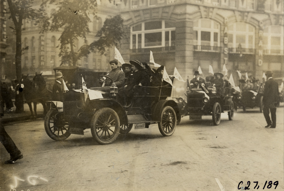 View of children and motorists in Maxwell cars during the 1909 annual excursion for orphans sponsored by the Orphan's Automobile Day Committee of New York. Cars are decorated with "Dreamland" pennants. Approximately 1,800 children were taken on a trip to the Dreamland amusement park at Coney Island. Stamped on back: "Spooner & Wells, Inc., photographers, telephones 3472-3473 Columbus, 1931 Broadway, New York." Handwritten on back: "Maxwell. Tours--New York Orphans Day outing, 1909."