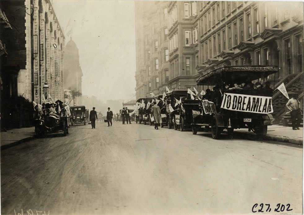 Rear view of cars and trucks lined up in street during the 1909 annual excursion for orphans sponsored by the Orphan's Automobile Day Committee of New York. Vehicles are decorated with "Dreamland" pennants, American flags and "To Dreamland" banners. Approximately 1,800 children were taken on a trip to the Dreamland amusement park at Coney Island. Stamped on back: "Spooner & Wells, Inc., photographers, telephones 3472-3473 Columbus, 1931 Broadway, New York." Handwritten on back: "Tours--New York Orphans Day outing, 1909."