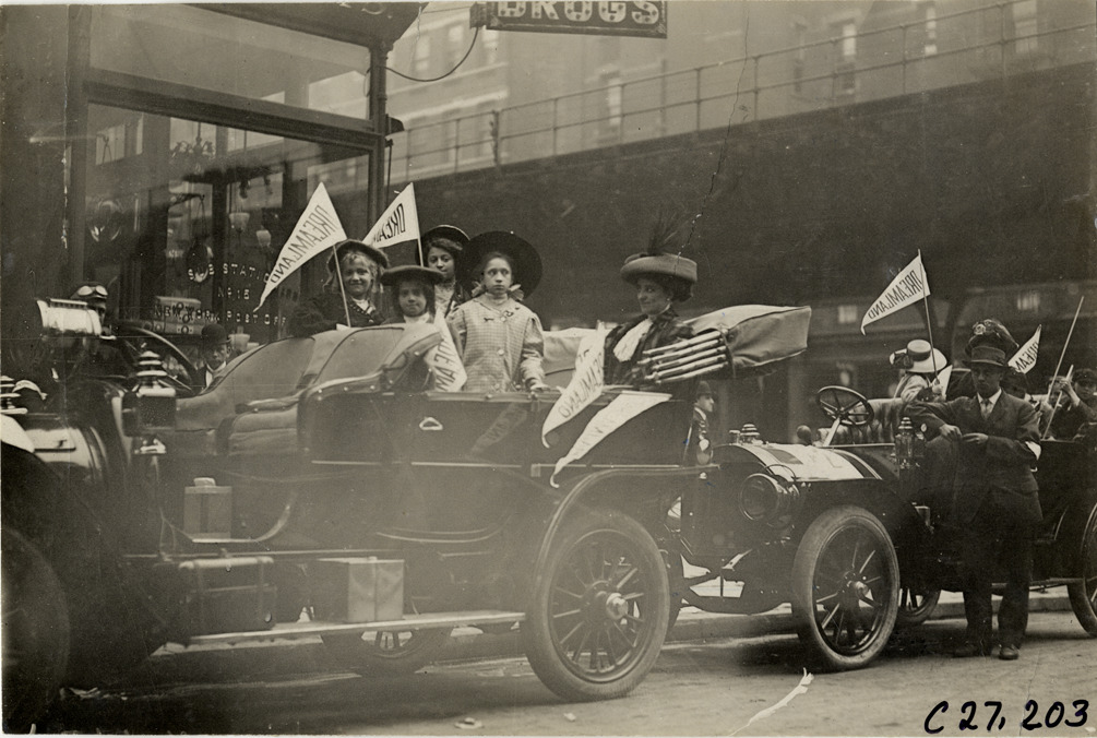 Children and motorists posing in Royal Tourist automobile, 1909 New York Orphans Day outing