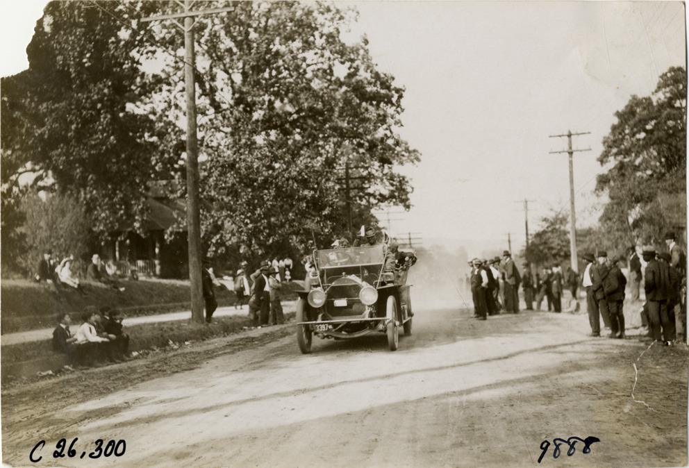 View of motorists in car during the 1909 New York to Atlanta Good Roads Tour. Spectators watch from roadside. Stamped on back: "Photo by N. Lazarnick. 244-6-8 W. 42nd Street, N.Y. Tel. 594 Bryant. In ordering duplicates mention number on back of this print." Handwritten on back: "Tours--New York-Atlanta Good Roads Tour, 1909."