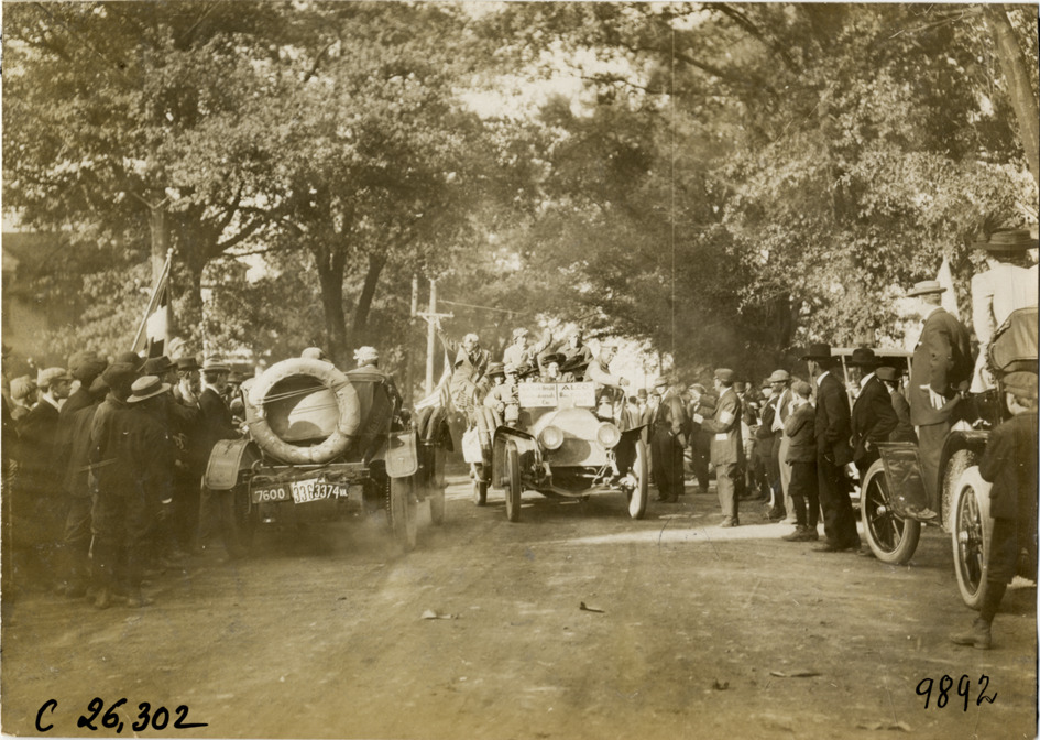 View of motorists in Alco official car during the 1909 New York to Atlanta Good Roads Tour. Cars and spectators on roadside. Handwritten on back: "Tours--New York-Atlanta Good Roads Tour, 1909."