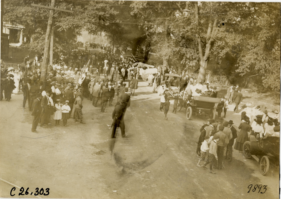 Motorists and spectators with automobiles, 1909 New York-Atlanta Good Roads Tour