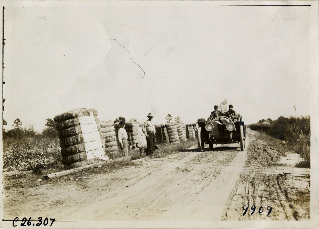 Motorists in Matheson automobile passing cotton bales on roadside, 1909 New York-Atlanta Good Roads Tour