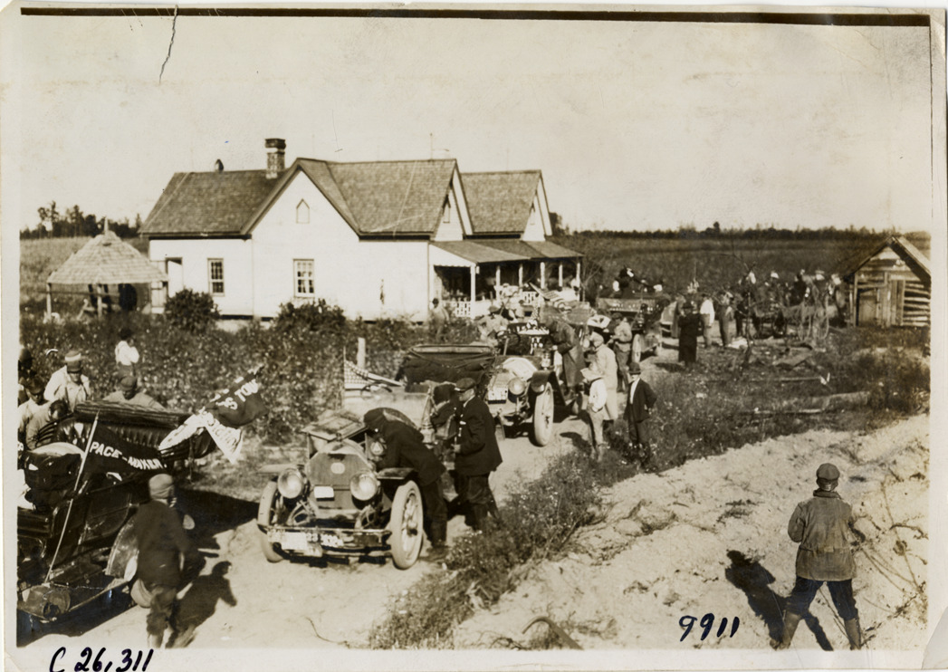View of motorists with cars lined up in front of farmhouse during the 1909 New York to Atlanta Good Roads Tour. Stamped on back: "Photo by N. Lazarnick. 244-6-8 W. 42nd Street, N.Y. Tel. 594 Bryant. In ordering duplicates mention number on back of this print." Handwritten on back: "Tours--New York-Atlanta Good Roads Tour, 1909."