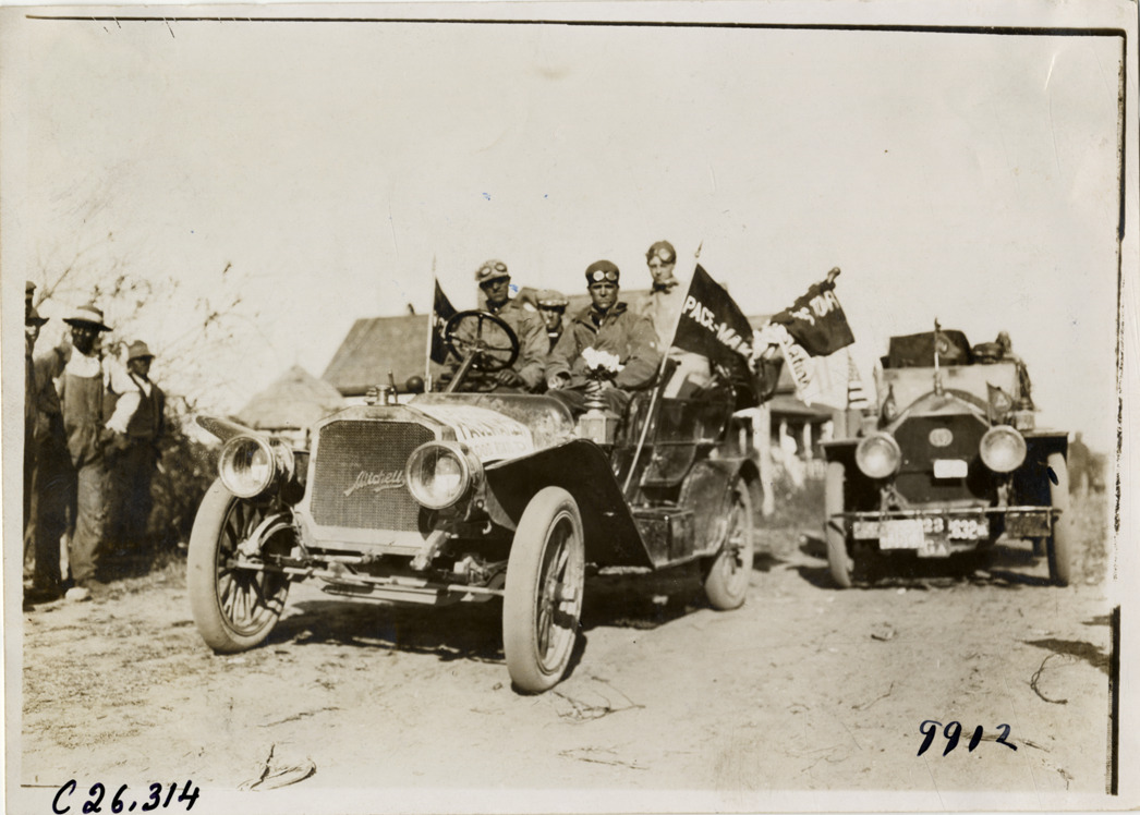 View of motorists posing in Mitchell pacemaker car during the 1909 New York to Atlanta Good Roads Tour. Stamped on back: "Photo by N. Lazarnick. 244-6-8 W. 42nd Street, N.Y. Tel. 594 Bryant. In ordering duplicates mention number on back of this print." Handwritten on back: "Mitchell official car. Tours--New York-Atlanta Good Roads Tour, 1909."