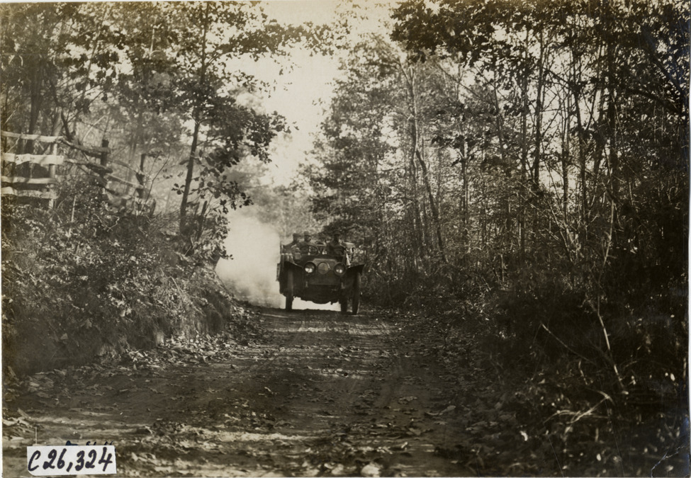 Motorists in automobile traveling on rural road, 1909 New York-Atlanta Good Roads Tour